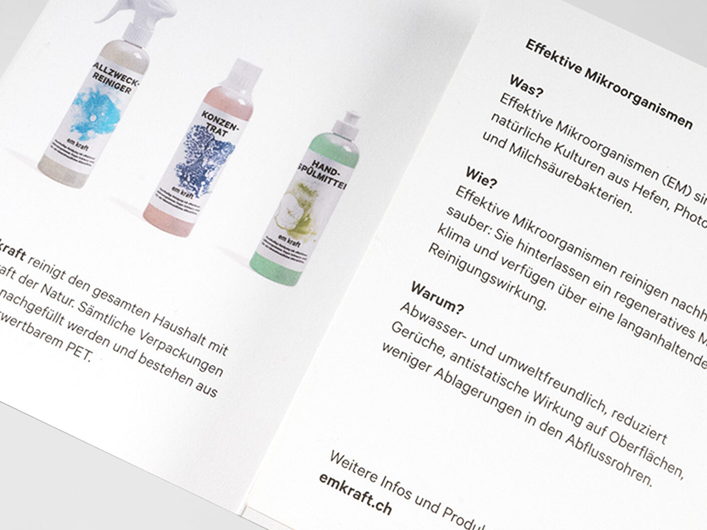 Für em kraft entwickelten wir ein umfassendes Corporate Design, das Etiketten, Printmedien und digitale Kanäle umfasst. Im Zentrum steht ein grafisch stark reduziertes Design: Die Formensprache greift abstrahierte Darstellungen der verschiedenen Reinigungsprodukte auf. Flüssigkeitsbewegungen, Abdrücke und Tropfen werden als abstrakte Formen in ein flexibles Gestaltungsraster integriert. Dieses Raster sorgt für ein einheitliches Erscheinungsbild und spiegelt zugleich die dynamische, regenerative Kraft der Inhaltsstoffe wider. Das Ergebnis ist eine klare Markenidentität, die Nachhaltigkeit und Funktionalität gleichermaßen vermittelt.