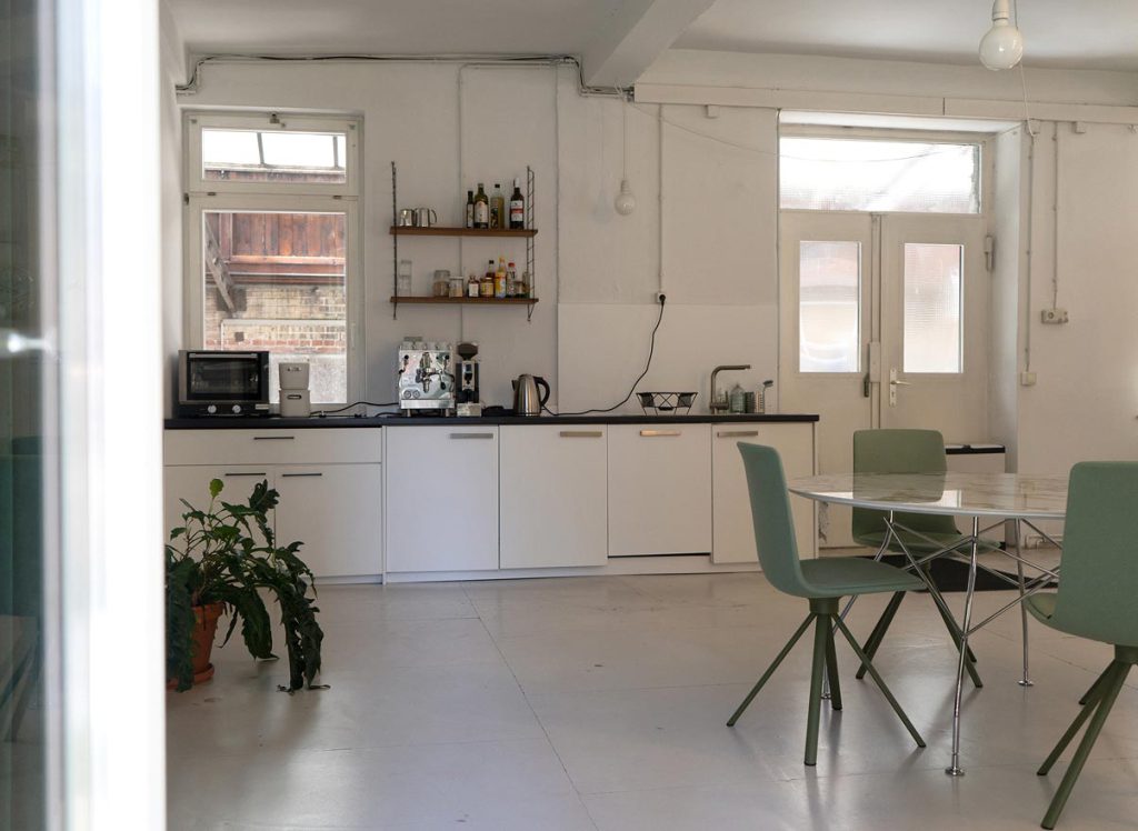 Aus einem ehemaligen Lagerraum entstand ein offenes und flexibles Loft. Neben den regulären Arbeitsplätzen gibt es ein Fotostudio und eine Siebdruckwerkstatt.